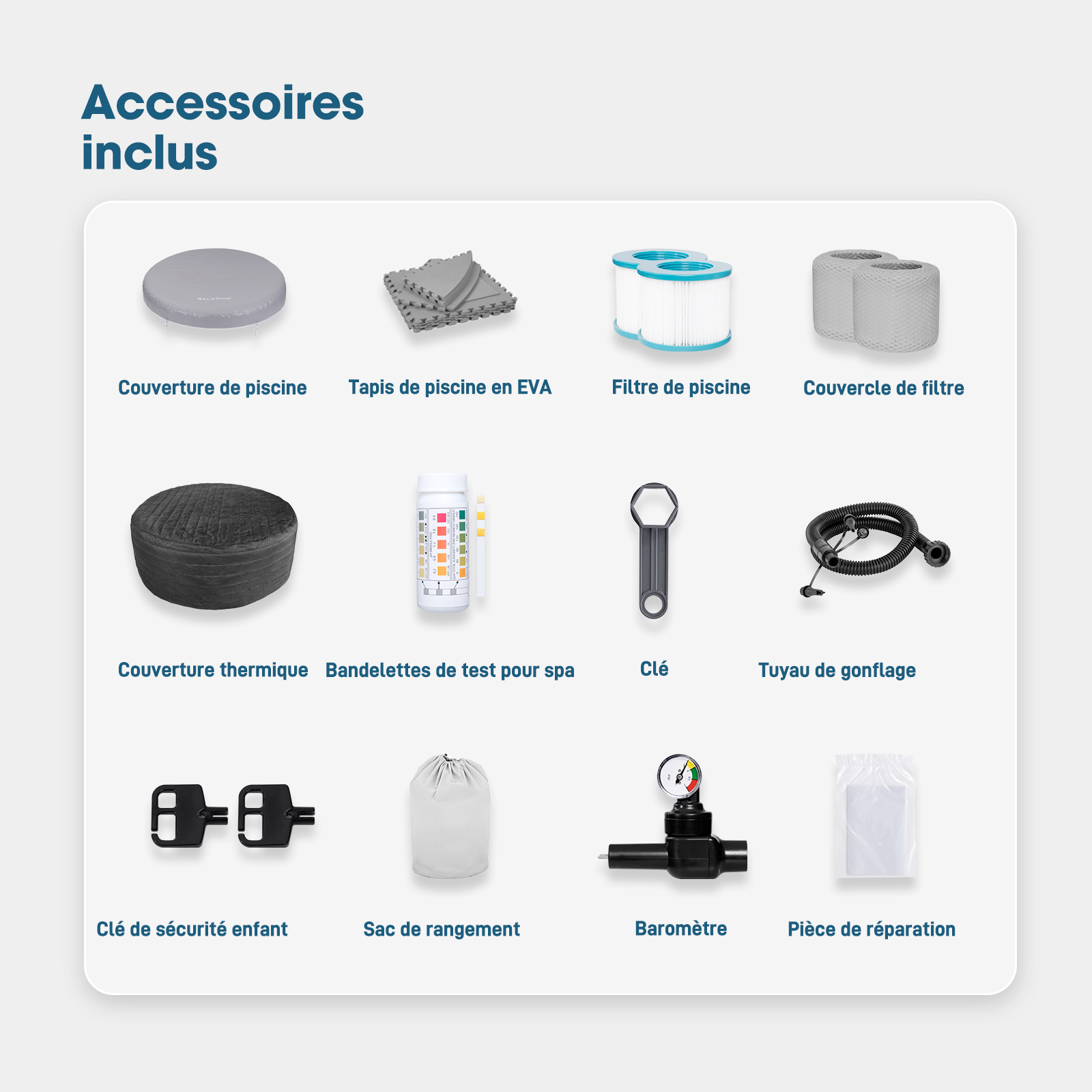 🌊FULL SET OF ACCESSORIES: 1 thermal cover, 1 EVA pool mat, 1 hand pump (auxiliary inflation), 2 filter cartridges & 2 covers, 20 strips water testing, 2 PVC patches, 1 spanner, 1 inflation hose, 1 air valve cap, 1x way valve, 1 drainage bung, 2 child safety key, 1 power cable, 1 storage bag, 1 instruction manual.