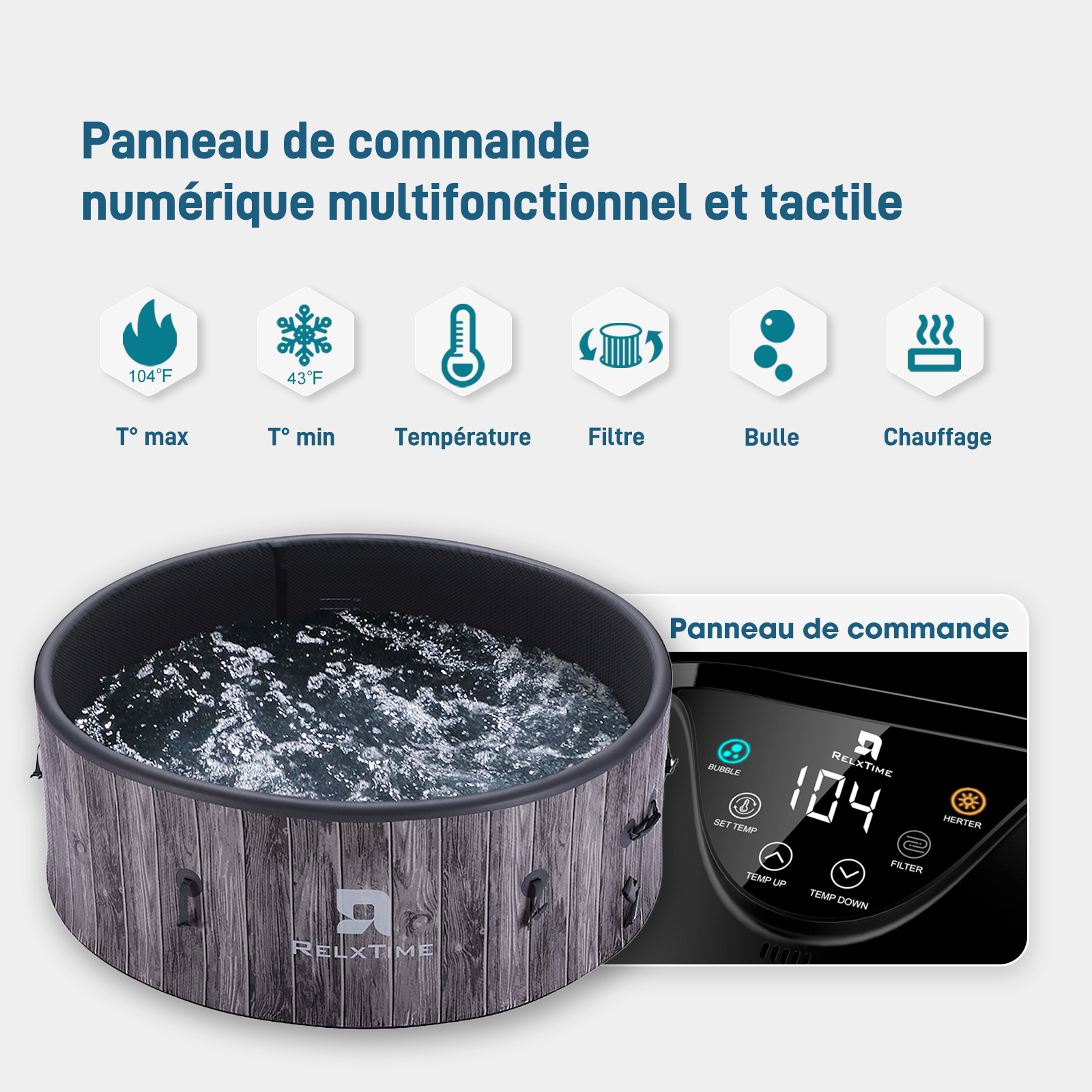 🌊HOT TUB WITH BUBBLE MASSAGE: The RELXTIME inflatable hot tub is made for up to 4-6 people and heats up to a soothing 104 °F (40 °C) with 130 surrounding powerful air bubbles, built-in integrated water filtration system to keep the water clean. Durable laminated PVC inflated walls for durability and comfort.