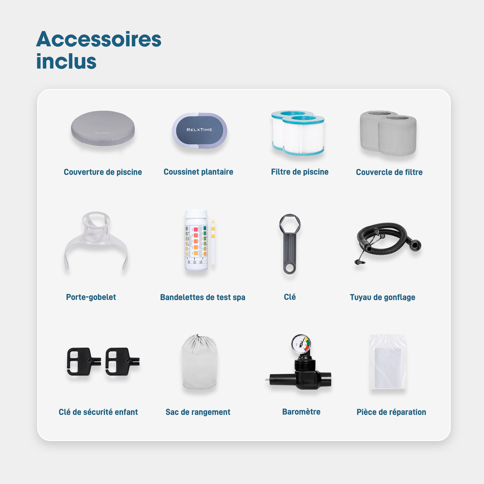 Comme pour tous les spas Relxtime, il peut être facilement monté et gonflé en moins de 10 minutes, prêt à être rempli d'eau. Aucun outil ni installation professionnelle n'est nécessaire.