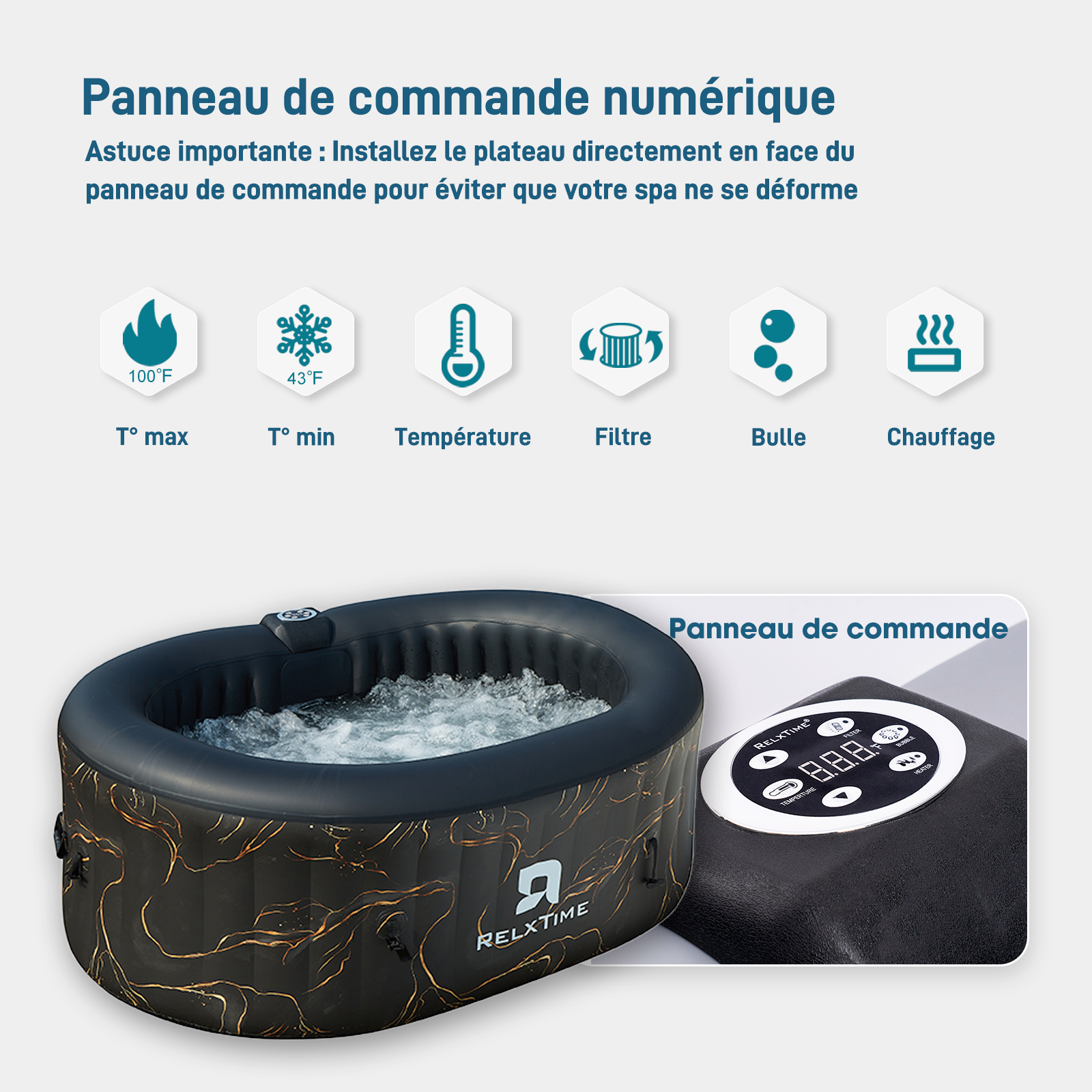 - Spa gonflable pour 2 personnes : spa gonflable RELXTIME avec 100 jets à bulles apaisants à haute puissance et un système de filtration d'eau intégré pour garder l'eau à l'intérieur propre.