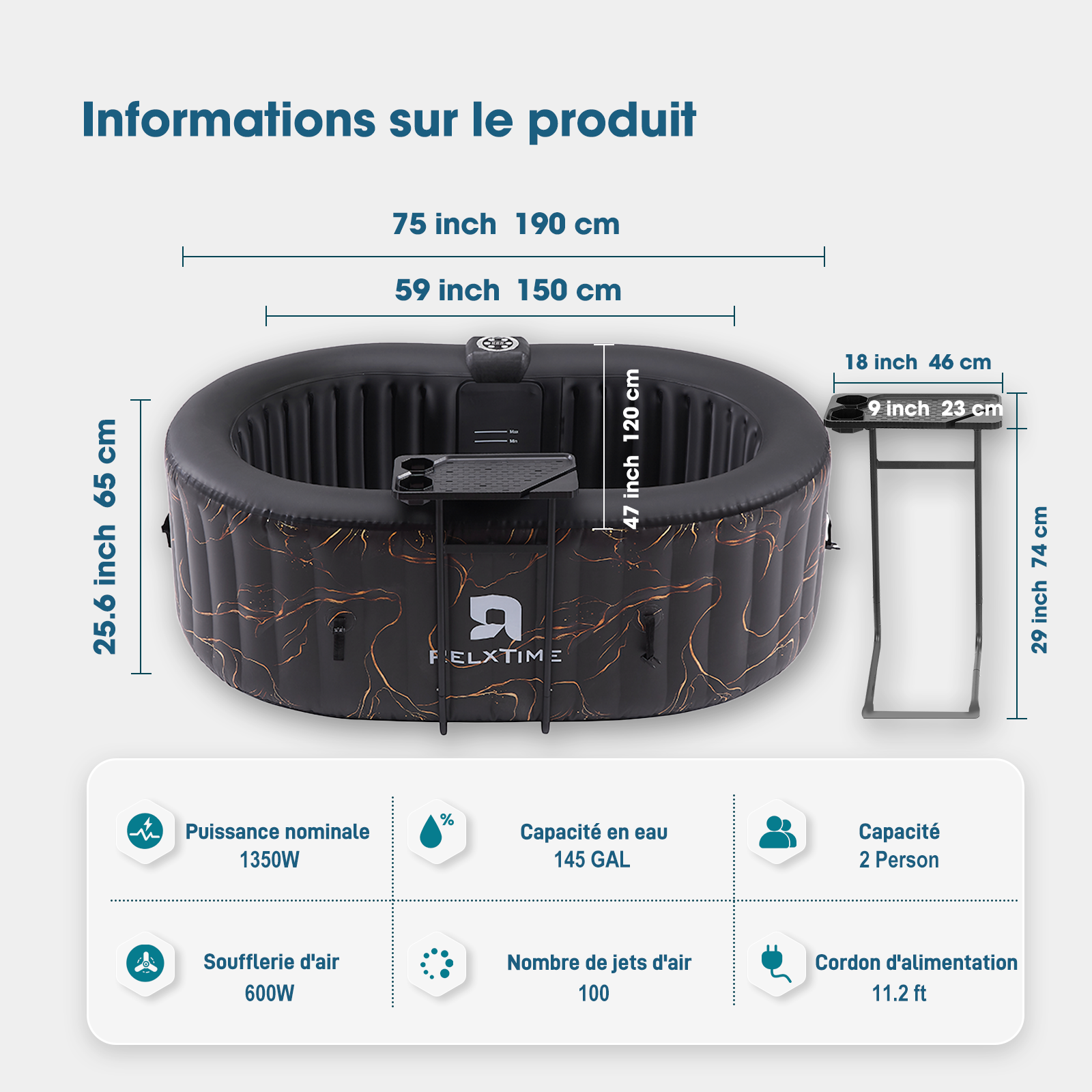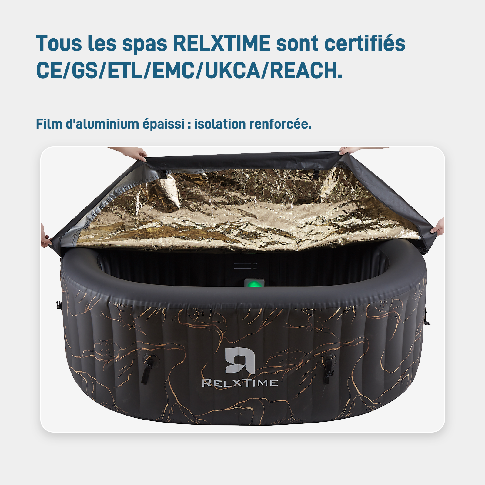 - Construction robuste avec poutres : Baignoire portable en PVC laminé durable avec structure verticale en « I » qui rigidifie les parois et les rend résistantes aux éraflures et aux perforations, garantissant ainsi la stabilité et la stabilité de votre spa. Tous les spas à jets d'air RELXTIME sont homologués CE/GS/ETL/EMC/UKCA/REACH.