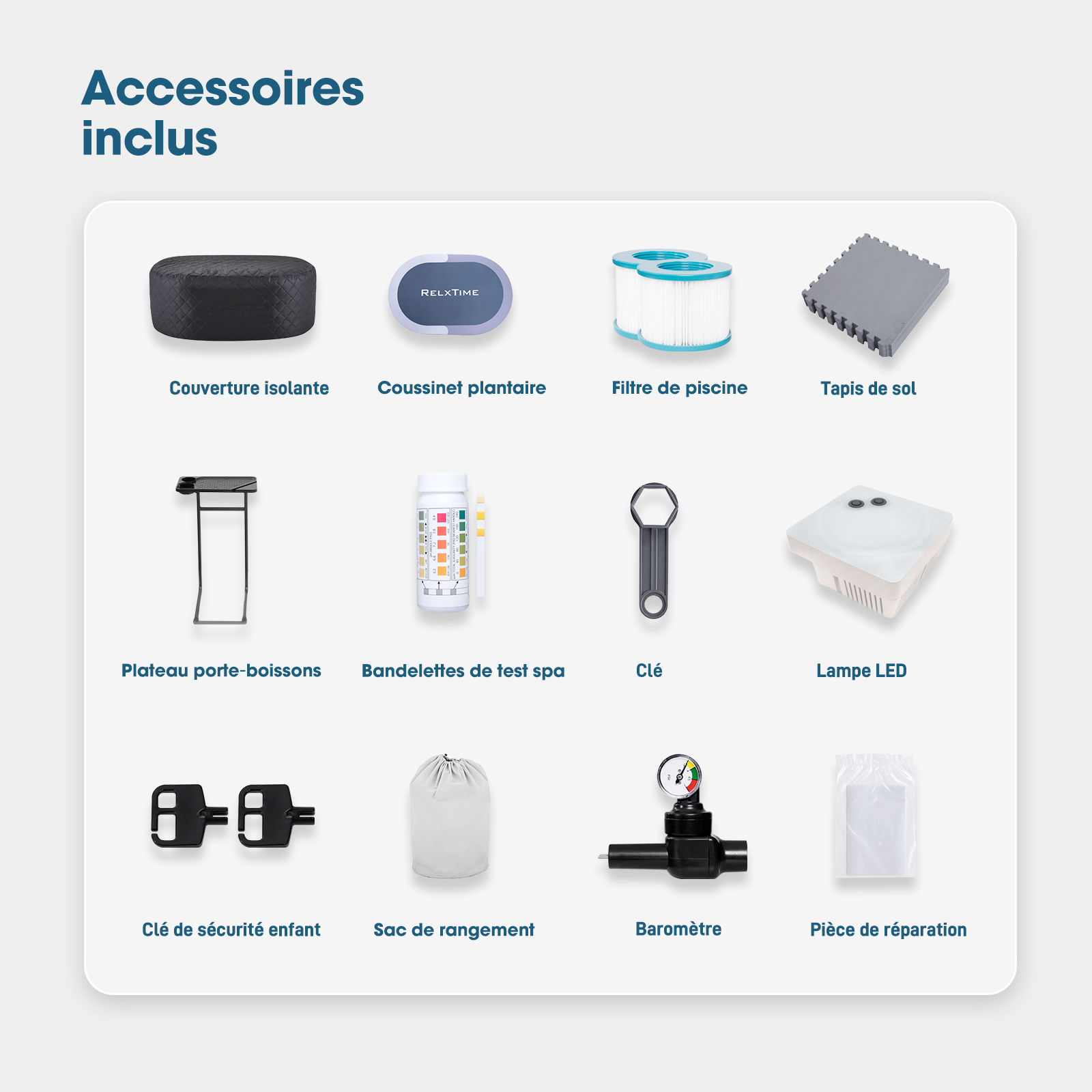 - Plusieurs accessoires compatibles : 1 housse isolante, 1 tapis de sol EVA, 1 lumière LED (nécessite 3 piles AAA, non incluses), 1 couverture de piscine, 2 cartouches et 2 couvercles de filtre, 1 plateau à boissons, 1 tuyau de gonflage, 1 cordon d'alimentation, 1 sac de rangement et 1 livret d'instructions.